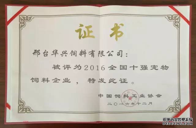 2016年12月9日,中國飼料工業(yè)協(xié)會第七次會員代表大會在北京召開,會議對2016年度中國飼料工業(yè)協(xié)會先進(jìn)集體及先進(jìn)工作者進(jìn)行了表彰, 華興公司榮獲“2016全國十強(qiáng)寵物飼料企業(yè)”稱號。
